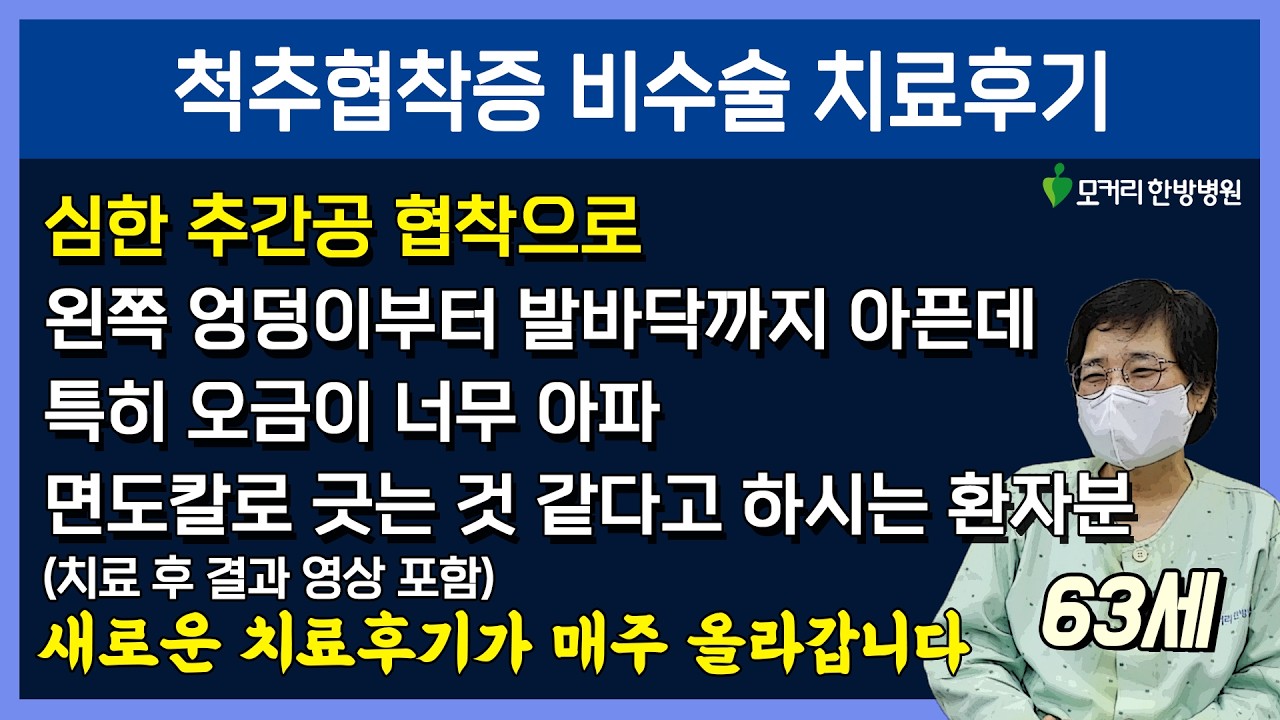 모커리한방병원에서는 추간공협착증은 물론, 고령층의 말기 협착증도 수술 없이 재활치료로 치료하고 있습니다. 실제로 척추관이 심하게 막혀있지만 재활치료로 증상이 좋아진 환자 사례는 정말 많습니다. 아래 이런 환자분들의 영상을 모아놓았으니 꼭 보시길 바랍니다.