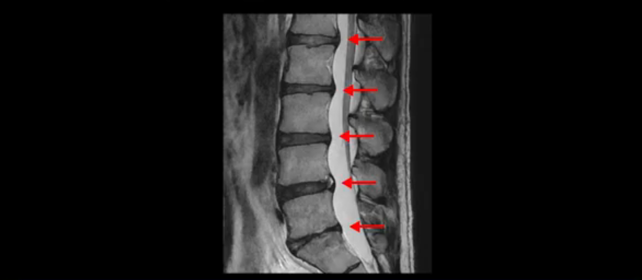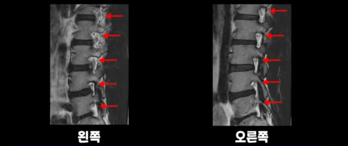 우선 이분 MRI를 보면 허리 모든 마디의 디스크가 퇴행되어 있고