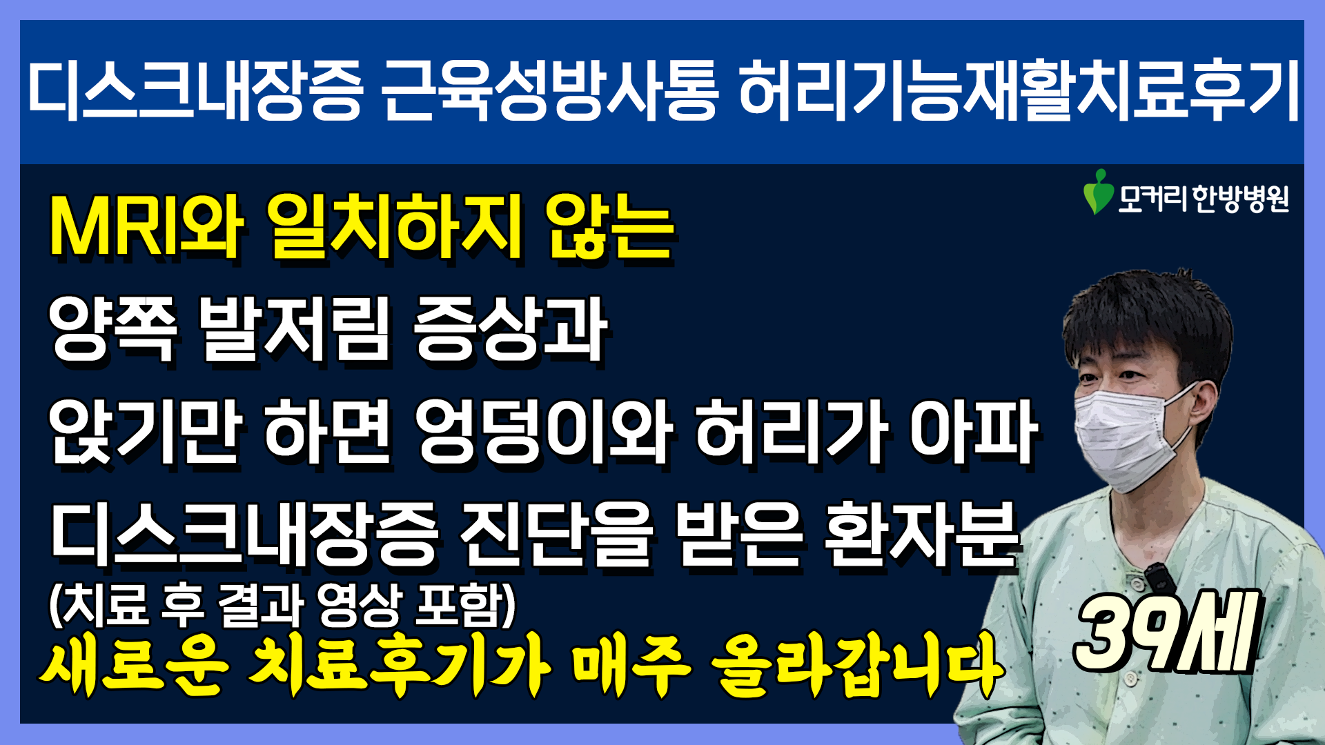 저는 병원을 믿고 디스크 치료를 했던 건데 디스크가 원인이 아닐 수도 있겠다는 생각이 들어서 그때부터 많이 찾아보기 시작했죠. 유튜브 검색을 하다가 운동방법 많이 봤고 그리고 저랑 비슷한 환자들 치료후기 그런 거 많이 보고 찾아왔어요. 치료후기 영상에 MRI랑 증상이 매치가 잘 안 되는 분들 계시고 그리고 어차피 수술할 생각은 없으니까 모커리에 오게 됐습니다.