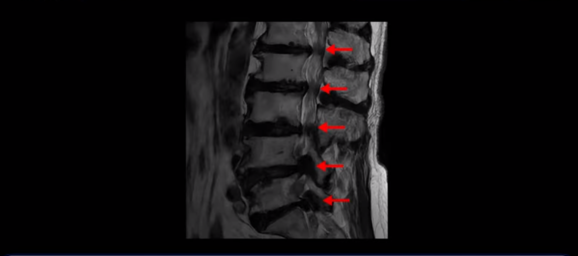 MRI 보시면 (2-8) 허리의 5마디가 전부 다 심하게 퇴행되어 있습니다.