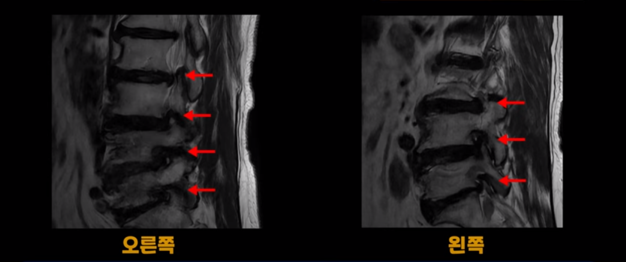 이렇게 모두 다 심하게 막히는 경우는 드문데요. 또한 오른쪽, 왼쪽 신경이 빠져나가는 추간공도 다 심하게 막혀있습니다.