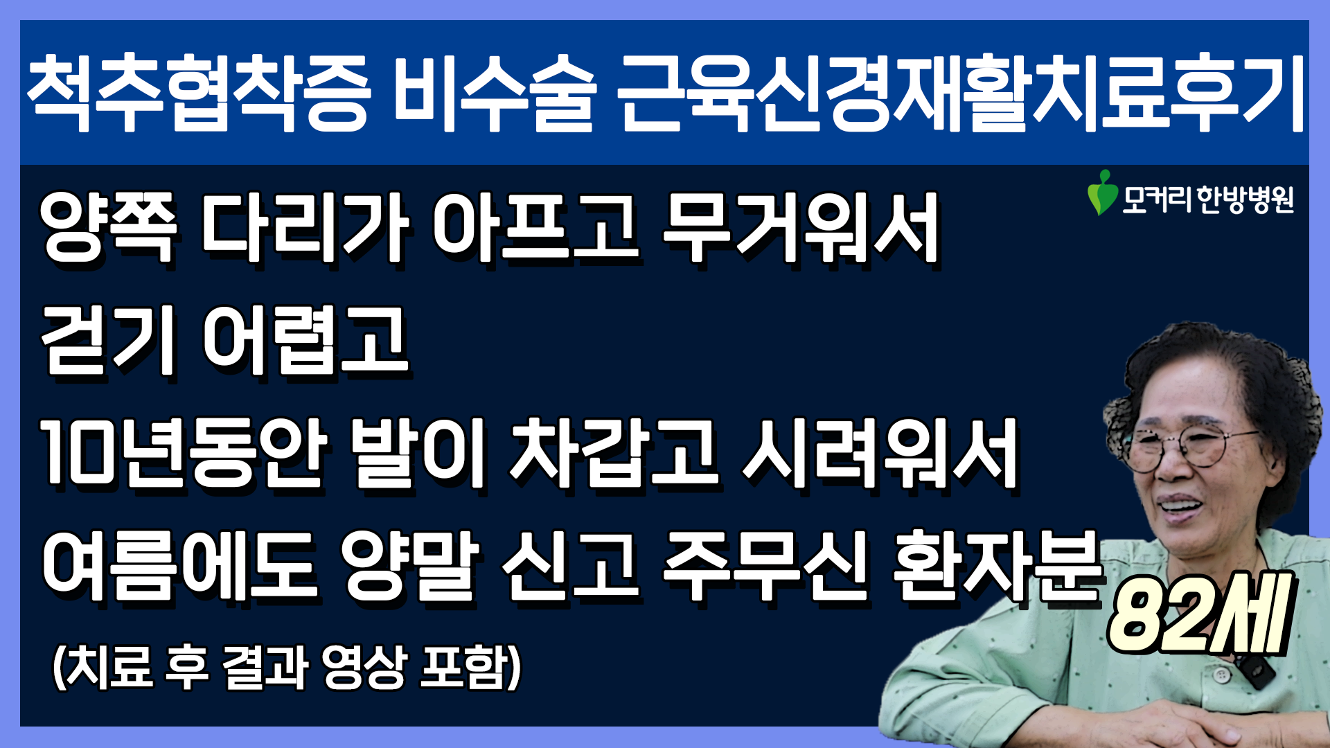 이렇게 입원해서 치료하고 쉬고 운동하고, 치료하고 쉬고 운동하고를 매일매일 2주~4주 정도 계속 반복해서 근육 상태가 좋아지면, 허리를 더 잘 지탱해 주니까 신경이 덜 눌리게 되고 협착증 증상이 훨씬 더 좋아지게 됩니다. 이분은 3주 입원 치료를 받으셨습니다. 그럼, 이분의 3주 간의 근육신경재활치료 결과는 어떻게 됐을까요? 10년 동안 발이 시렸던 게 좋아졌을까요? 다리가 아파 걷지 못했는데 안 아프게 잘 걸을 수 있게 되었을까요?