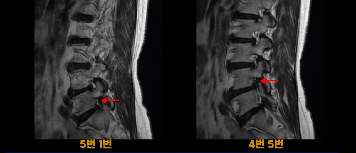 하지만 이 디스크 파열은 오래된 걸로 보이며, 지금 이 환자분의 아픈 양쪽 다리 특히 양쪽 발의 통증, 발 시린 증상과는 관련이 없어 보입니다. 오른쪽 왼쪽의 신경가지가 빠져나가는 추간공을 보면 오른쪽은 5번 1번과 4번 5번이 많이 좁아져 있고
