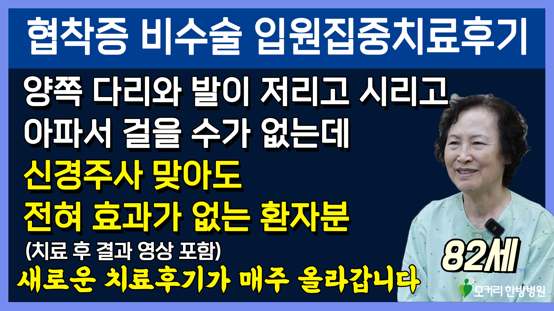 이렇게 입원해서 치료하고 쉬고 운동하고, 치료하고 쉬고 운동하고를 매일매일 2주~4주 정도 계속 반복해서 근육 상태가 좋아지면, 허리를 더 잘 지탱해 주니까 협착증 증상이 훨씬 더 좋아지게 됩니다. 그럼 이분의 근육신경재활치료 결과는 어떻게 되었을까요? 양쪽다리와 발이 저리고 아프고 시려서 잘 걷지도 못하셨는데 4주 만에 잘 걸을 수 있게 되었을까요? 아프고 저리고 시린 증상이 다 사라졌을까요? 근육신경재활치료의 장점은 허리가 재활을 통해 더 튼튼해지고 건강해지는 겁니다. 허리에 손상을 주는 수술과는 달리 근육재활치료는 허리에 어떠한 형태로든 손상이 없고 반대로 더 튼튼해지는 겁니다. 그게 정말 큰 장점이고 그래서 관리만 잘하고 가르쳐드린 가벼운 운동만 꾸준히 해주시면 치료효과가 오래도록 유지될 수 있는 겁니다. 또 근육신경재활치료는 환자가 80세 이상 고령이여도 별 문제 없이 할 수 있다는 게 큰 장점입니다. 이분의 치료 후 결과가 궁금하시다면 아래 영상을 꼭 보시길 바랍니다.
